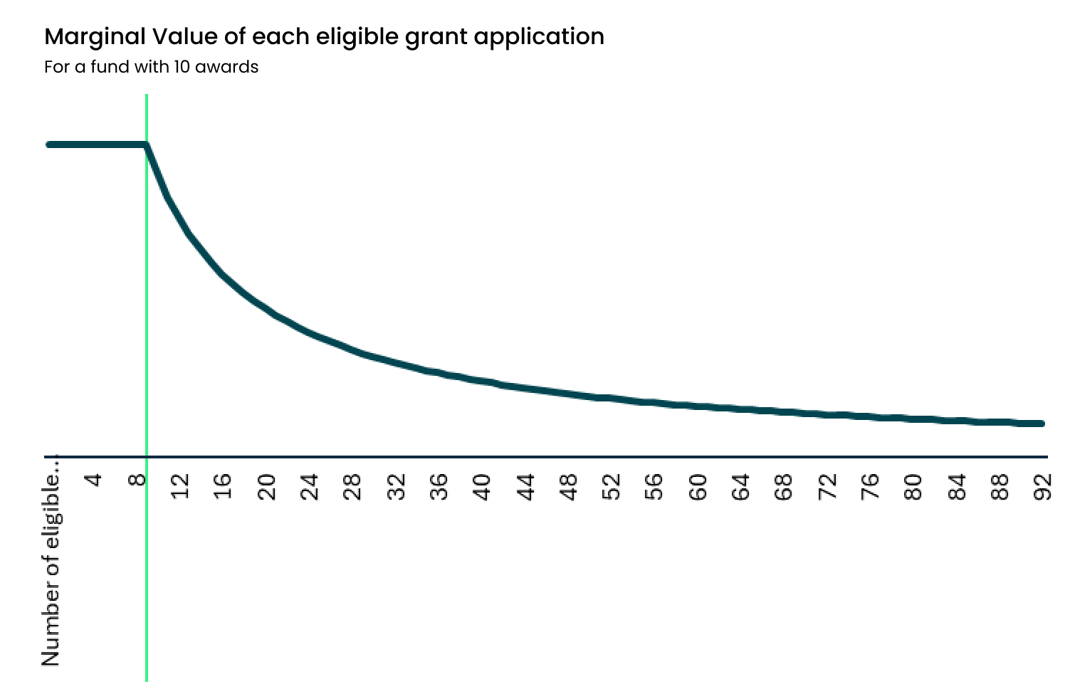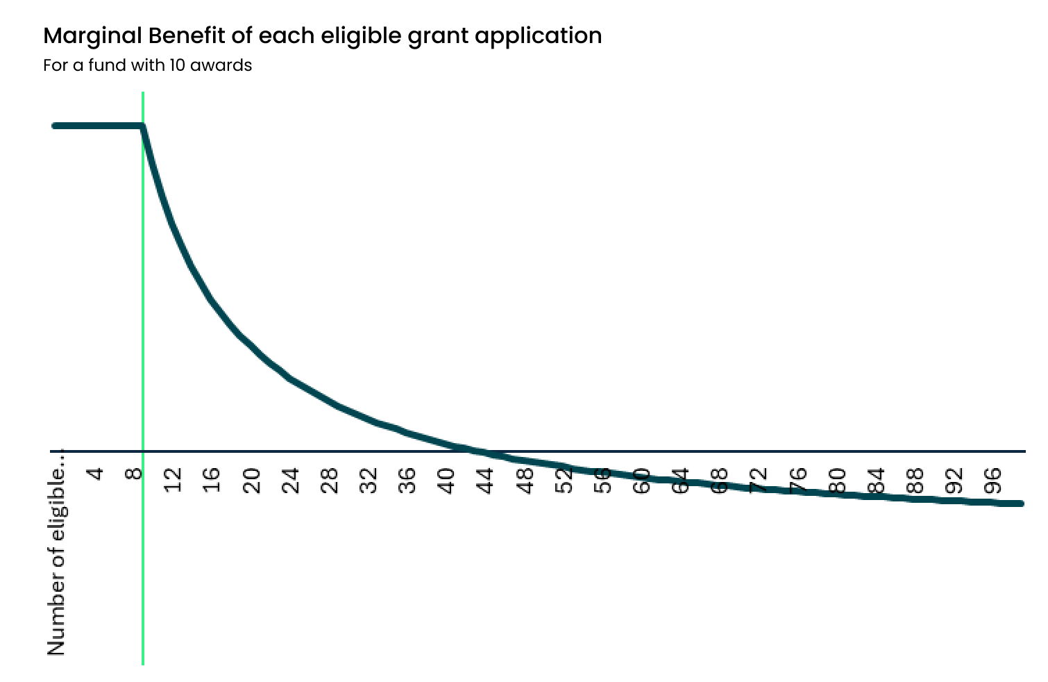 Once we have answers to these 3, we can then model the marginal cost of each eligible application to the funder. We can then subtract the marginal cost from the marginal value, and get the “marginal benefit” of an additional eligible grant application.