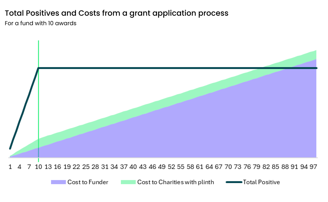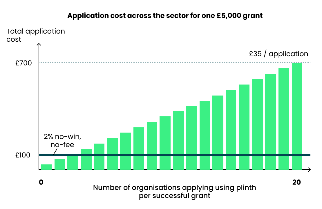 Using plinth, we’re not only reducing costs for an individual charity, we’re also capping that fee to 2% of the grant value. That means the “cost to the funder” is now much closer to becoming the “biting constraint”: